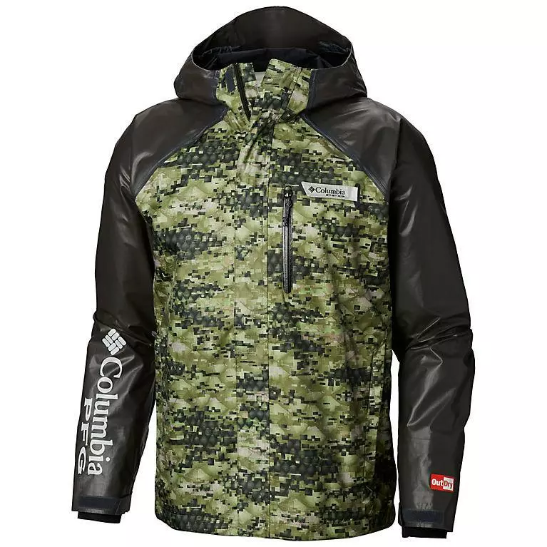 A versatile angler-friendly jacket featuring waterproof-breathable construction, adjustable hood, waist, sleeves, and cuffs, and a unique camo print design.